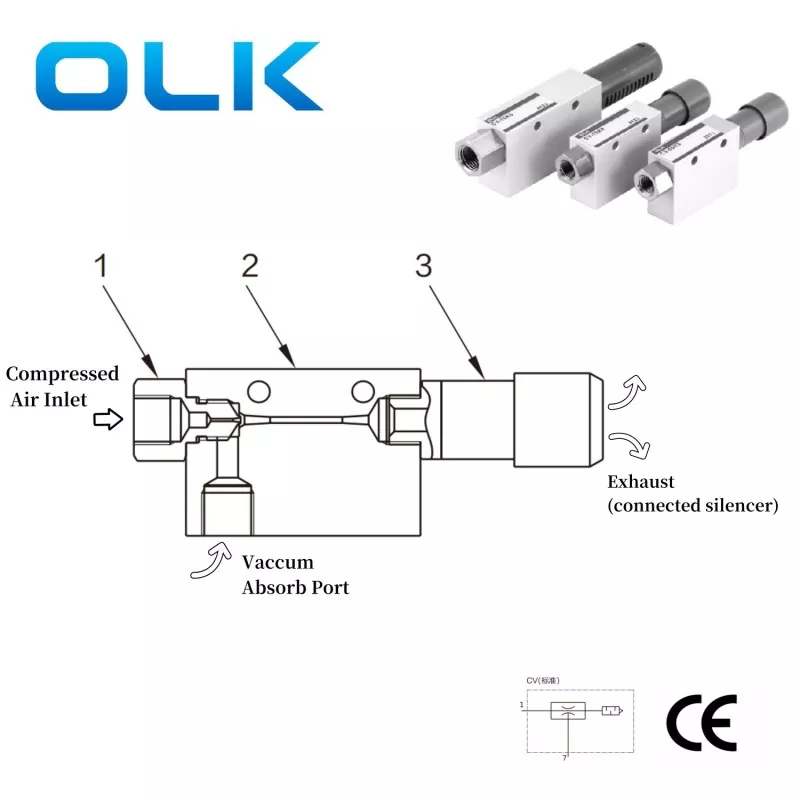 از ژنراتورهای خلاء CV Ouleikai (OLK) برای تأمین محیط خلاء مورد نیاز برای نازل یا وسایل مکش استفاده می شود. درگاه ورودی باید به هوای فشرده متصل شود ، در حالی که فنجان مکش به درگاه خلاء وصل شده است. هنگامی که هوای فشرده شده از درگاه ورودی به درگاه اگزوز جریان می یابد ، خلاء در درگاه خلاء ایجاد می شود. از این نیروی خلاء می توان برای چسبیدن به اشیاء ، دستیابی به وظایفی مانند رفع یا پشتیبانی استفاده کرد و در نتیجه باعث بهبود کارایی عملیاتی در تولید صنعتی می شود.