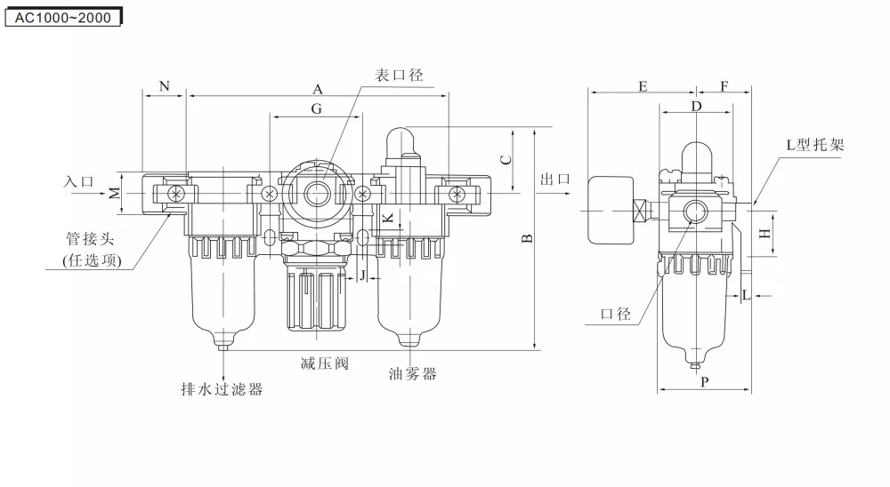 AF (فیلتر هوا) + AR (شیر تنظیم فشار) + AL (روغن کننده مه روغن) = واحد سه گانه AC
