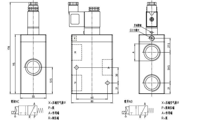 اندازه پورت نخ (P ، A ، R) در G3/8 ، G1/2 و G1 با درگاه هوای فشرده شده (X) در G1/8 موجود است.